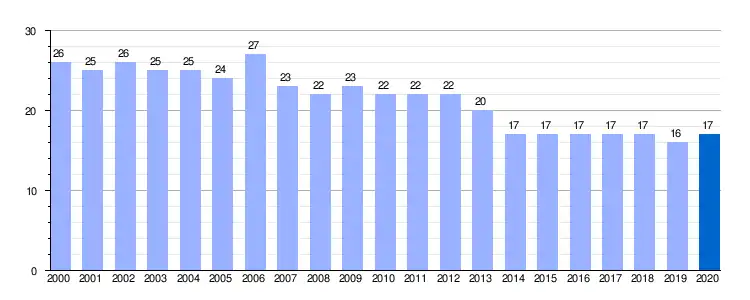 | Gráfica de evolución demográfica de Báscones de Valdivia entre 2000 y 2020 |