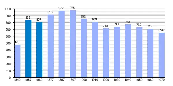 | Gráfica de evolución demográfica de Béznar[1] entre 1842 y 1970 |