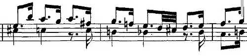 Posteriormente, Bach realiza una variación de lo anterior, ahora utilizando solo semicorcheas. En el compás 39 parece haber llegado a Sol M, pero lo oscurece con el Napolitano. En el compás siguiente, del mismo modo, oscurece la Dominante y en siguiente oscurece el bajo en la que sería la décima variación.