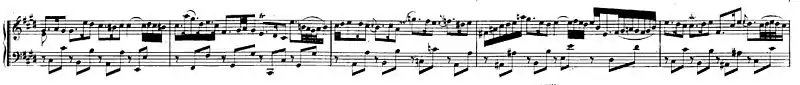 8, el cual Jones (2013) ha descrito como hermoso e inquietante. En forma da capo, el ritornello sostenido de cuerdas está acompañado por el clavicémbalo con una realización explícita del bajo cifrado mediante suaves semicorcheas de acordes rotos. Después del ritornello de apertura, el clavicémbalo, acompañado de acordes de corchea separados en las cuerdas, toca su propia línea melódica dividida en dos largas frases cada vez más ornamentadas, la segunda de las cuales se funde con el acompañamiento de semicorchea del ritornello de cierre.[16][17][14][7]