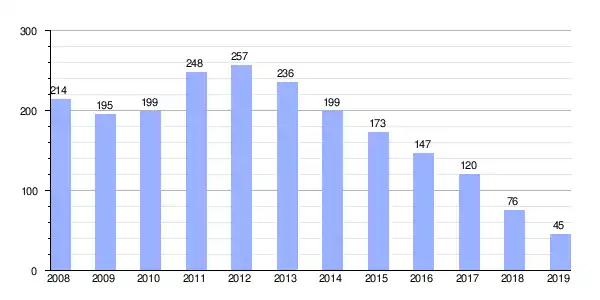 | Gráfica de evolución demográfica de Bacares[20] entre 1842 y 2021 |