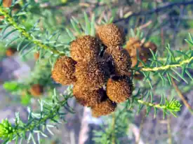 Es un arbusto de 15 dm de altura, pudiendo alcanzar los 3 m; su follaje es denso, glutinoso, persistente. Presenta hojas simples, alternas, sésiles, filiformes. Es una especie dioica: flores masculinas infundibuliformes, las femeninas en capítulos amarillentos, con aquenios comprimidos, agrupadas en las extremidades de las ramillas, de 5 a 14 mm de diámetro. Tiene floración en primavera y verano. El fruto es un aquenio apretado con abundancia de vilanos (pelos) de color amarillento, fructificando en verano-otoño. La semilla no suele pasar los dos milímetros[2]