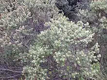 Es un arbusto muy ramificado de hasta 2 metros de altura. Sus pequeñas hojas romboidales casi siempre son dentadas. Sus flores compactas son de color blanco a amarillo.