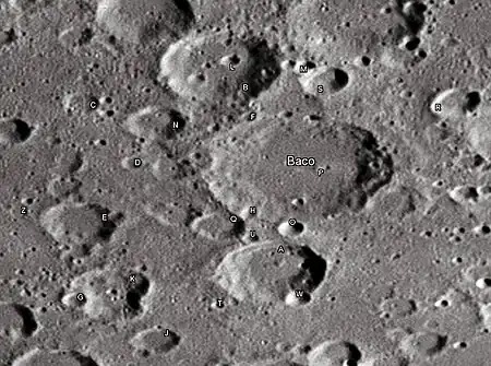 Hay varios cráteres menores situadas en el terreno circundante, incluyendo los cráteres satélite Baco A localizado hacia el sur y Baco B al noroeste. Más al norte se encuentra el cráter Breislak, y a la misma distancia hacia el noreste está Ideler. Más hacia el oeste se encuentra Cuvier, mientras que Asclepi se encuentra al sureste. A pesar de que este cráter fue nombrado en honor del británico Roger Bacon, el nombre fue elegido por el selenógrafo alemán Mädler, que lo transcribió como Baco.