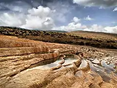 Como resultado de este proceso, en el transcurso de miles de años, las aguas que emanan de estos dos muelles de la cordillera se han combinado y han dado lugar a una serie de piscinas escalonadas de forma natural, de colores naranjas, rojas y amarillas. La vegetación que rodea al norte se compone de bosques de pinos, mientras que hacia el este se compone principalmente de árboles bajos y arbustos. Al oeste del sitio pueden observarse canteras de roca.[2]