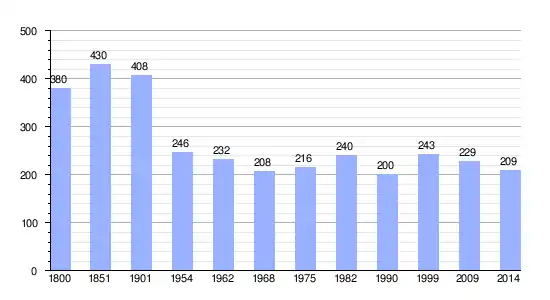 Los datos demográficos contemplados en este gráfico de la comuna de Bagnols-les-Bains[4] se han cogido de 1800 a 1999 de la página francesa EHESS/Cassini, y los demás datos de la página del INSEE.[5]
