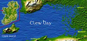 - Esta obra contiene una traducción derivada de «Clew Bay» de Wikipedia en inglés, publicada por sus editores bajo la Licencia de documentación libre de GNU y la Licencia Creative Commons Atribución-CompartirIgual 4.0 Internacional.