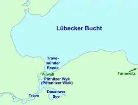 - Esta obra contiene una traducción derivada de «Bay of Lübeck» de Wikipedia en inglés, publicada por sus editores bajo la Licencia de documentación libre de GNU y la Licencia Creative Commons Atribución-CompartirIgual 4.0 Internacional.