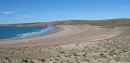 Se trata de una amplia bahía de arena de un kilómetro de extensión por 200 m de ancho. En sus extremos norte y sur se hallan grandes afloramientos porfíricos ignimbríticos que encierran la bahía. La punta ubicada en el extremo norte se llama Punta Norte, ubicada frente a la Isla Castillo y a 3 km de la Isla Pingüino. En el extremo sur se encuentra la Punta Azopardo, donde se halla una baliza.