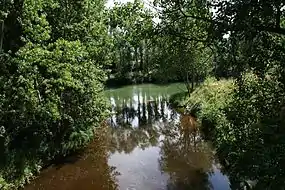 ![]() Desembocadura del río Bayas (agua marrón oscura) en el río Ebro (agua verdosa) a la altura de la ciudad de Miranda de Ebro. Julio de 2009. | ||