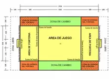 El terreno de juego es un rectángulo de 27 metros de largo y 12 metros de ancho. El área de juego es de 15 metros de largo y 12 metros de ancho delimitado por líneas de una anchura máxima de 8 centímetros. Las porterías son como las del Handball tienen 2 metros de alto y 3 metros de ancho.