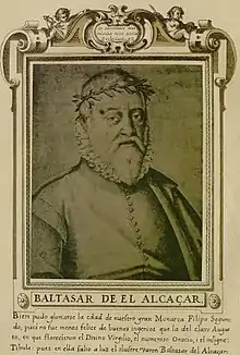![]() Retrato de Baltasar del Alcázar por Francisco Pacheco, Libro de descripción de verdaderos retratos, de ilustres y memorables varones, Madrid, Biblioteca de la Fundación Lázaro Galdiano | ||