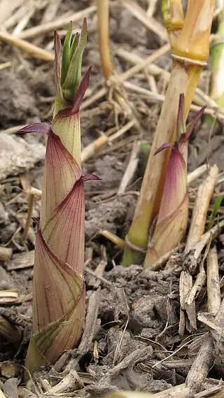 ![]() Brotes del bambú Phyllostachys aureosulcata. | ||