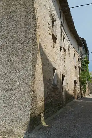 - Casa de la Abadía (casa parroquial). La reconstrucción llevada a cabo en torno a 1980 alteró profundamente su estado original: se colocaron ventanales de los siglos XVI y XVIII procedentes de otras edificaciones de la localidad, así como otros de nueva factura. A la derecha de la puerta se insertó el escudo del monasterio de san Juan de la Peña, al que perteneció la parroquia.[9][10] Estaba unida por un pasadizo elevado a la iglesia parroquial, del que queda un arco rebajado.[11]