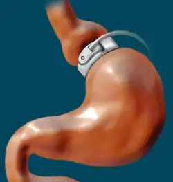 En el 2001 la Administración de Alimentos y Drogas (FDA) de EUA aprobó el sistema BGA que consiste en colocar, por medio de una laparoscopia en lugar de la vía abierta o por laparotomía, una banda inflable alrededor de la porción superior del estómago y apretarla como un cinturón para formar un pequeño saco que sirve para formar un nuevo y mucho más pequeño estómago para limitar y controlar la cantidad de alimento que el paciente ingiere y demorar el proceso de vaciado del estómago al intestino (duodeno). El limitar el alimento que se ingiere y prolongar el proceso de vaciado del estómago da como resultado final la pérdida de peso.