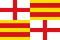 Bandera apaisada de proporciones dos de alto por tres de largo, 1r y 4o cuarteles, de plata, con una cruz llena de gules; 2o y 3r cuarteles de oro, cuatro palos de gules.