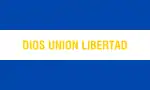 Y la Lema "Dios Unión Libertad" están representadas en tres palabras de cada una pintadas de color ámbar de la bandera civil:[7]
