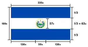 La bandera de El Salvador consiste de tres franjas horizontales iguales, los dos azules que están en la parte superior y en la parte inferior, y el blanco se ubica en el centro de la bandera.[5][6] La variación vigente se distingue en tres tipos en función de su uso, la Bandera Magna se lleva con el Escudo Nacional en la franja central, el uso civil tiene dos versiones: la primera dejada en blanco a la franja central, y la segunda se lleva de un lema salvadoreño en la franja central.