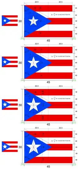 Actual bandera con azul medio adoptada 03 de agosto de 1995 (28 años) por el gobierno puertorriqueño electo después de emitir una regulación que identificó los colores pero no especificó los tonos de color; azul medio reemplazó al azul oscuro como de facto tono del triángulo[1] | |