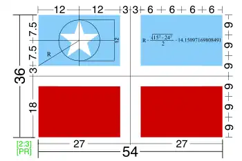 | Diseño | Consiste de una cruz griega grande y blanca en el centro que se extiende a sus cuatro lados, dividiéndola en cuatro rectángulos iguales, dos rojos y dos azules, llevando el superior izquierdo una estrella centrada y blanca de cinco puntas | |