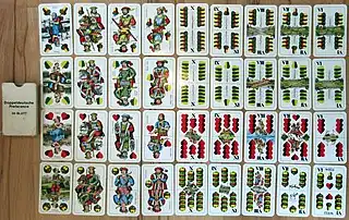 - La baraja germano-francesa: es una mezcla entre las mencionadas, con la cantidad y nombre de las cartas igual que la baraja alemana, excepto por los Unter y Ober que se reemplazan por los Bube (Valet) y Dame (Señora), y los palos igual que la baraja francesa. Los Tréboles y Corazones conservan su color (Negro y Rojo, respectivamente), mientras que las Picas y Diamantes cambian su color a verde y amarillo, respectivamente.