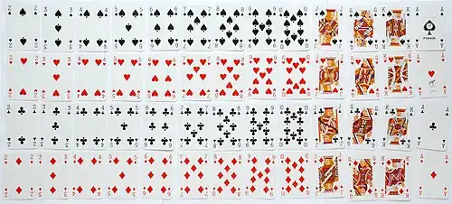 | Baraja Inglesa, organizadas del 2 al As, y de arriba hacia abajo por "Picas"; "Corazones"; "Tréboles" y "Diamantes". | Baraja Francesa, que a diferencia de la Inglesa, la "J"; la "Q"; la "K" y la "A", se reemplazan por la "V"; la "D"; la "R" y el "1", respectivamente. |