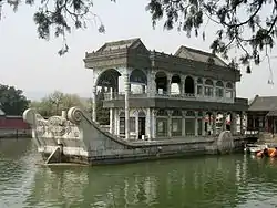 El pabellón resultó destruido en 1860 por fuerzas anglofrancesas, durante la Segunda Guerra del Opio.[1] Fue restaurado en 1893[1] por orden de la Emperatriz Viuda Cixí. En esta restauración se diseñó una nueva superestructura de dos pisos que incorporaba elementos de la arquitectura europea. Al igual que en su predecesor la nueva superestructura está hecha de madera pero su pintura imita el mármol. Hay un gran espejo en cada "cubierta" y a cada lado del barco que sirve para reflejar las aguas del lago y dar una impresión de inmersión total en el medio acuático además de permitir contemplar el lago en todas direcciones mientras se toma té. Ruedas de paletas de imitación situadas a cada lado del pabellón hacen que recuerde a un vapor de ruedas.[1] El pabellón tiene un sofisticado sistema de drenaje que canaliza el agua de lluvia a través de cuatro pilares huecos. Finalmente el agua es arrojada al lago por la boca de cuatro cabezas de dragón.