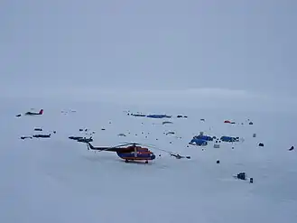 El campamento sobre el hielo es el principal componente de la infraestructura de expediciones turísticas al Polo Norte, un complejo único para acoger visitantes y el personal de base. El campamento se compone de carpas especialmente diseñadas con marcos rígidos.Todas las tiendas tienen calefacción y la temperatura interior se mantiene entre 15 y 18 ° С.