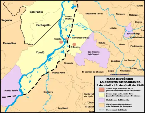 El asesinato de Jorge Eliécer Gaitán produjo brotes de violencia en el país.[12] En Barrancabermeja, municipio obrero y de marcada inclinación gaitanista, la noticia del magnicidio como era natural generó la inicial ira hacia los Conservadores y la posterior congregación espontánea de la población frente a la alcaldía (hoy Plaza Luis Pinilla Rueda, una de las víctimas mortales de ese día). Durante esta asamblea popular se desconoció al Gobierno Nacional del conservador Mariano Ospina Pérez y se creó una Junta Revolucionaria de Gobierno compuesta por personalidades del municipio que a través de aplausos fueron elegidos para integrarla. Esto fue una marcada diferencia con otras Juntas del país en donde sus miembros fueron puesto a dedo por los comités políticos.