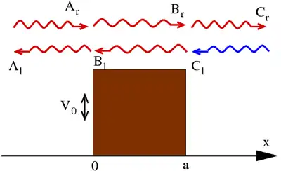 (Una forma más elegante de expresar el potencial es en función de la función escalón de Heaviside, definida por . Entonces, el potencial se expresa como ). Con esta elección del origen de coordenadas, la barrera se encuentra entre y . Sin embargo, es posible cualquier otra elección del origen de coordenadas sin que cambien los resultados.