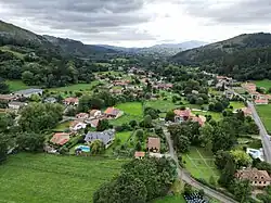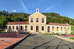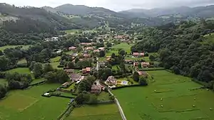- Antiguas Escuelas del Barrio de Arriba, promovida por el indiano Francisco del Cerro Escudero, vecino del lugar emigrado a México. En 1909 tenía una renta anual de 15.800 pesetas. En un principio hubo una escuela en la casa del fundador, en el barrio La Caseriza, si bien no reunía las condiciones necesarias y es en 1911 cuando se construye el nuevo edificio por el arquitecto de prestigio Joaquín Rucoba a instancias de la Fundación Cerro.[8] El edificio está diseñado con un cuerpo central de dos alturas, la planta baja funcionó como capilla, y con dos alas laterales destinadas a aulas. La fachada central se decoró con un hastial escalonado, al que se añadió posteriormente una singular estructura de cuatro alturas a modo de torre campanario y coronada con una cruz.[9] La actividad docente estuvo a cargo de los Hermanos de La Salle durante los cuatro primeros años, siendo director durante un breve tiempo Cirilo Bertrán, a la postre beatificado por Juan Pablo II. Saturnino Gallego Iriarte, cuenta en su libro «Sembraron con Amor: La Salle, centenario en España»[10] las causas de la salida de la congregación de estas escuelas: