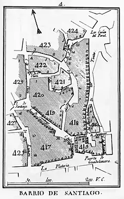 Con la destrucción del barrio cayeron las iglesias de Santiago, Santa Clara y San Juan, esta última ubicada en la manzana 430 en la calle de San Juan. Era muy antigua y estaba dedicada a los dos santos Juanes (Evangelista y Bautista). En su bóveda halló sepultura el pintor Velázquez cuyos restos se perdieron con la demolición. La feligresía de San Juan pasó a la iglesia de Santiago[lower-alpha 3] que se llamó desde entonces Santiago y San Juan.[28][lower-alpha 4]