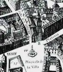 Siguiendo el recorrido perimetral desde la calle del Espejo que a la altura de San Bartolomé hace una curva y se dirige al oeste, se llega a la calle de Santa Clara. Recibió este nombre del convento franciscano de monjas Clarisas fundado en 1471 por Catalina Núñez al quedare viuda del tesorero del rey Enrique IV[13] Alonso Álvarez de Toledo señor de Villafranca. Las casas del matrimonio tenían tribuna a la iglesia de Santa Clara y a la de Santiago. La manzana 429 abarcaba el convento con su iglesia, la de Santiago y las casas del matrimonio citado. Fueron casas con historia y con solera pues en ellas se alojaron los reyes Juan II y Enrique IV y en 1435 vivió en ellas Álvaro de Luna; en ellas nació su hijo Juan que fue conde de Santisteban y Alburquerque y apadrinado por los reyes. El nacimiento se celebró con gran pompa y la madre del neófito, Juana de Pimentel, fue obsequiada por los reyes con un rubí.[17] El siguiente propietario de estas casas fue el conde de Lemus pero todas ellas desaparecieron bajo las ordenanzas de derribo de José Bonaparte. Al mismo tiempo desaparecieron las casas de las manzanas 419, 420, 421, 422, 423 y 424. En ellas habían tenido su vivienda personajes de la antigua nobleza castellana de los siglos XV y XVI. Terminada la contienda contra Napoleón estos solares se reestructuraron y así nacieron las calles de la Unión, Amnistía[lower-alpha 1] , Cruzada, Independencia, Santa Clara y plazuela, Vergara, Ramales, Lazo, Lemus y Velázquez.[19][lower-alpha 2]