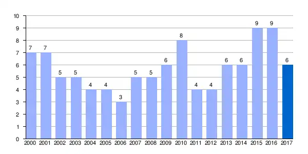 | Gráfica de evolución demográfica de Barrundia[1] entre 2000 y 2017 |