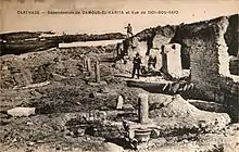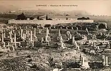 Las primeras excavaciones descubrieron un columbario que contenía urnas funerarias,[13] así como cisternas de la época romana.[14] Fragmentos de mármoles de la época pagana fueron identificados por Delattre, en particular, epitafios.[15]