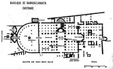 Un edificio enorme en un inicio (medía 65 por 45 metros[3] con nueve naves y once intercolumnios para el espacio central), el sitio se componía, además de la basílica, de un baptisterio y de un conjunto que podía haber albergado monjes (o religiosos, según Delattre[40]). En su último estadio, el monumento estaba muy reducido, únicamente con tres naves y cinco intercolumnios, lo que denota una fuerte degradación.[41]