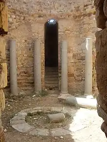 La cripta tenía dieciséis columnas de mármol rosado, de un alto de 3,45 metros y distanciados 1,60 metros el uno del otro,[51] así como hornacinas. Solo una columna ha quedado intacta, mientras que las otras fueron recuperados por el equipo de excavación.[52] Capiteles de la época de Teodosio han sido hallados en el monumento y están expuestos en el Museo Nacional de Cartago. Fueron decorados de águilas o carneros y se alternaban con las hornacinas.[18] El suelo tenía un mosaico en mal estado[53] y un estilóbato de dos metros de diámetro que podría haber estado compuesto de columnas. Las lozas de cimentación tenían un largo de sesenta centímetros.[54] El piso superior tenía un tholos con un deambulatorio.[37] Una columna períptera habría sido remplazada por un macizo cuadrangular.[55]