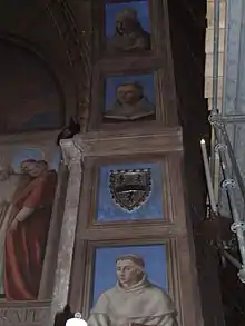 - lápida con el escudo de armas de la familia Papafava da Carrara, debajo de la cual están enterrados los restos de algunos miembros de la familia, como Marsilietto Papafava da Carrara, señor de Padua. Los restos fueron trasladados aquí después de que la capilla en el sagrado fuera demolida en 1873.[15]