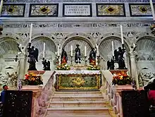 - sarcofago di Pietro Riario, patriarca di Alejandría; en la parte superior se puede ver el relieve del prelado, obra de un maestro veneciano desconocido.