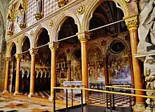 En las paredes del atrio de la capilla se encuentran las placas sepulcrales del matemático y astrólogo Andrea Argoli da Tagliacozzo y de Angelo Diedo, procurador de San Marco y benefactor de la construcción de la capilla. Ambas placas son obra de Giovanni Bonazza. Las bandas de mármol blanco con representaciones de lirios y cabezas de querubines son obra del mismo escultor, mientras que la puerta es una obra de Giovanni Battista Pellegrini que data de 1711.