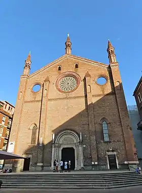 El edificio muestra la influencia de la arquitectura cisterciense borgoñona y tiene algunos elementos de similitud con la basílica de San Francisco en Bolonia.[4] La iglesia está precedida, en el exterior, por una escalinata de mármol de 8 peldaños que permite el acceso al atrio de la iglesia. La fachada principal de barlovento, realizada en ladrillo visto, tiene dos contrafuertes cuadrangulares colocados en los extremos derecho e izquierdo y se divide en dos niveles, separados entre sí por un marco horizontal colocado a dos tercios de la altura total del edificio. La fachada está dividida en tres partes por otros dos contrafuertes que rematan en el centro del nivel superior con una cúspide en forma de pirámide[1].
