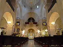 El interior del templo se divide en tres naves, de estilo post-herreriano, caracterizado por la robustez y severidad de los paramentos, creando una sensación de rigidez en contraposición con la fachada. A la sacristía se accede por el lado del Evangelio, mientras que en la Epístola se encuentra la capilla de la Vera Cruz de Caravaca. El cuerpo superior se organiza a modo de deambulatorio que permite contemplar el resto de la iglesia. Posee un órgano en el coro alto, construido en 1776 por el maestro José Folch y seriamente dañado durante la Guerra Civil. Su restauración se llevó a cabo en 2003 y acompaña a los actos religiosos de mayor importancia.