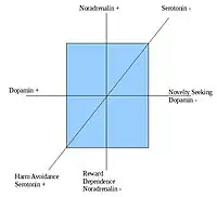 - Búsqueda de novedad (Novelty seeking=NS): grado en el que las personas son impulsivas, correlacionado con una baja actividad de dopamina.