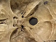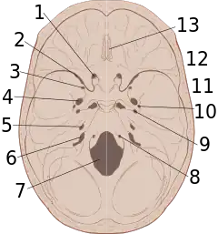La base del cráneo está perforada por numerosos orificios que dan paso a nervios, arterias y venas. Algunos de los más importantes son los siguientes (no relacionado con la enumeración de la imagen):