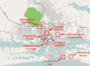 Las fuerzas de la ONU pasaron a tomar el control del aeropuerto de Abiyán después que las fuerzas de Gbagbo lo abandonaran. Las fuerzas de élite del presidente se atrincheraron en el palacio de gobierno. Las fuerzas de paz internacionales y francesas se apresuraron en controlar varias zonas de la ciudad mientras que tropas aún leales a Gbagbo lanzaron diversos ataques, uno contra la sede la de ONU, y otros contra los convoyes.[13] Ante lo violenta de la situación unos 500 extranjeros buscaron refugio en la base francesa de Port-Bouet, cerca del aeropuerto.[14][15]