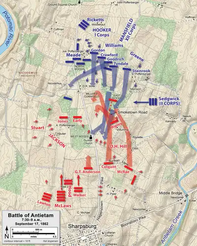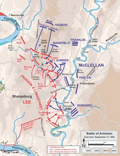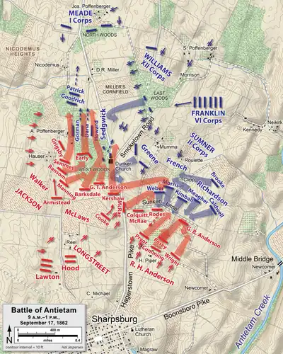 Tras perseguir al general confederado Robert E. Lee en el territorio de Maryland, el mayor general del Ejército de la Unión George B. McClellan atacó al ejército de Lee que había establecido posiciones defensivas tras el riachuelo Antietam. Al amanecer del 17 de septiembre, el Cuerpo de Ejército del mayor general Joseph Hooker realizó un poderoso ataque sobre el flanco izquierdo del ejército sudista. Los ataques y contraataques se extendieron a lo largo del maizal de Miller y alrededor de la iglesia de los Dunker (Dunker Church en inglés). La Unión logró finalmente penetrar por el centro del Ejército confederado atacando en la zona del Camino Hundido (Sunken Road), pero la ventaja de los federales no se consolidó. Por la tarde, el Cuerpo de Ejército del mayor general Ambrose Burnside entró en acción tomando un puente de piedra sobre el Antietam Creek y avanzando contra el flanco derecho del Ejército confederado. En un momento crucial, la división del mayor general A. P. Hill llegó procedente de Harpers Ferry. Pese a contar con una desventaja numérica de dos contra uno, Lee envió todas sus tropas, mientras que McClellan envió al combate menos de tres cuartas partes de las suyas, posibilitando a Lee plantar cara a los federales. Durante la noche ambos ejércitos consolidaron sus líneas. A pesar de las severas bajas, Lee continuó realizando escaramuzas contra McClellan el 18 de septiembre, mientras retiraba su maltrecho ejército al sur del río Potomac.[2]