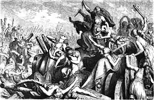 ![]() Las mujeres de los teutones defienden la fortaleza de carros, Heinrich Leutemann, 1882. | ||||
