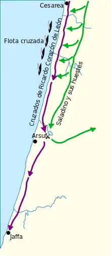 El plan de los cruzados incluía la captura de las principales fortalezas costeras antes del avance hacia Jerusalén, después de capturar Acre el 12 de julio de 1191 tras dos años de asedio (durante el cual las continuas disputas entre los reyes Ricardo y Felipe llevaron a que este último volviera a su país abandonando la Cruzada)[2] el monarca inglés se dirigió por la calzada romana que bordeaba la línea costera y que pasaba por Haifa y Arsuf a fin de no alejarse de su flota llena de suministros ya que el hostigamiento de las fuerzas musulmanas impedía el traslado seguro de aquellos por tierra.