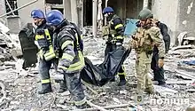 Socorristas transportando el cuerpo de un residente después del bombardeo ruso en noviembre de 2023.