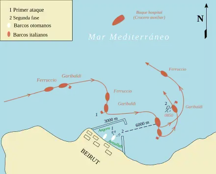 El ejército italiano temía que los barcos de la Armada otomana en el Mediterráneo atacasen los abastos y tropas que marchaban al África Oriental Italiana. El contraalmirante Paolo Thaon di Revel recibió la orden de impedirlo, eliminando para ello los barcos enemigos que se encontrasen en la rada de Beirut. Contó para la misión con dos cruceros acorazados: el Giuseppe Garibaldi y el Francesco Ferruccio,[1] ambos de la clase Giuseppe Garibaldi y armados con dos cañones de diez pulgadas situados en torretas, diez de seis pulgadas, seis de cuatro con siete pulgadas, diez de seis libras, diez de una libra, dos ametralladoras Maxim y cinco tubos torpederos.[2]